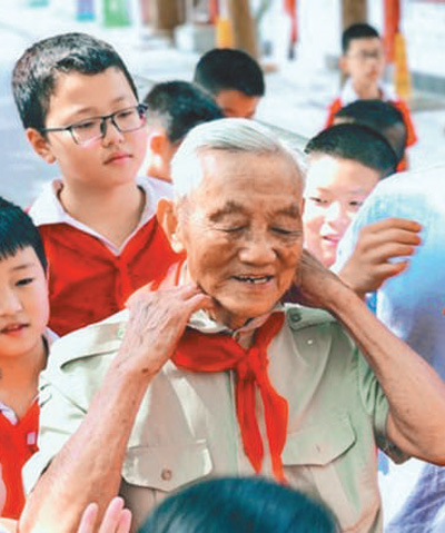 朱再保讲完课后,小学生给他系上红领巾。